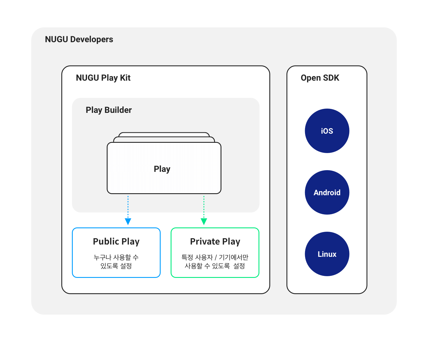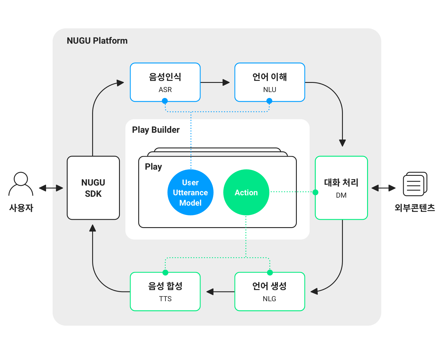 NUGU play kit은 대화 기반 인공지능 서비스를 개발할 수 있는 통합 개발 환경을 GUI 기반으로 제공함으로써, 사용자들은 쉽게 자신들의 서비스를 개발할 수 있습니다. NUGU play kit에서는 사용자 발화가 처리되는 과정에 필요한 요소 기술들을 제공하고 서비스를 개발할 수 있도록 하는 통합 개발 환경인 Play Builder가 제공됩니다. 개발된 서비스는 NUGU의 ‘심사’와 ‘배포’ 과정을 거친 후 스피커, T map, Btv, T전화 등의 PoC에서 사용자들에게 제공됩니다. 또한 특정 사용자 그룹이나 전용 디바이스에서만 해당 서비스를 제공하고자 할 경우에는 NUGU biz kit기능을 통하여 이를 설정할 수 있습니다.