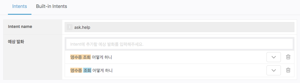 다음과 같이 같은 텍스트가 여러 개의 Entity Type으로 정의된 경우, 훈련 요청한 대로 실제 분석이 되지 않게 됩니다. 다음과 같이 ‘택배’라는 텍스트가 연락처를 의미하는 ‘CONTACTS’와 기능을 의미하는 ‘FUNCTION’에 포함된 경우 중의성이 발생하여 원하는 결과를 얻을 수 없을 가능성이 높습니다.