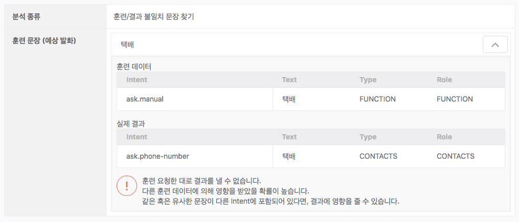 | 훈련/결과 불일치 문장 찾기 | 훈련 문장이 실제로 입력되었을 때, 요청한 대로 분석되는지 검사합니다. |