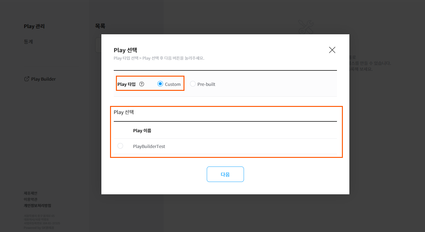 1. Play 등록하기 버튼을 클릭하세요. Play Builder에서 개발한 Play 리스트 팝업이 표시됩니다.