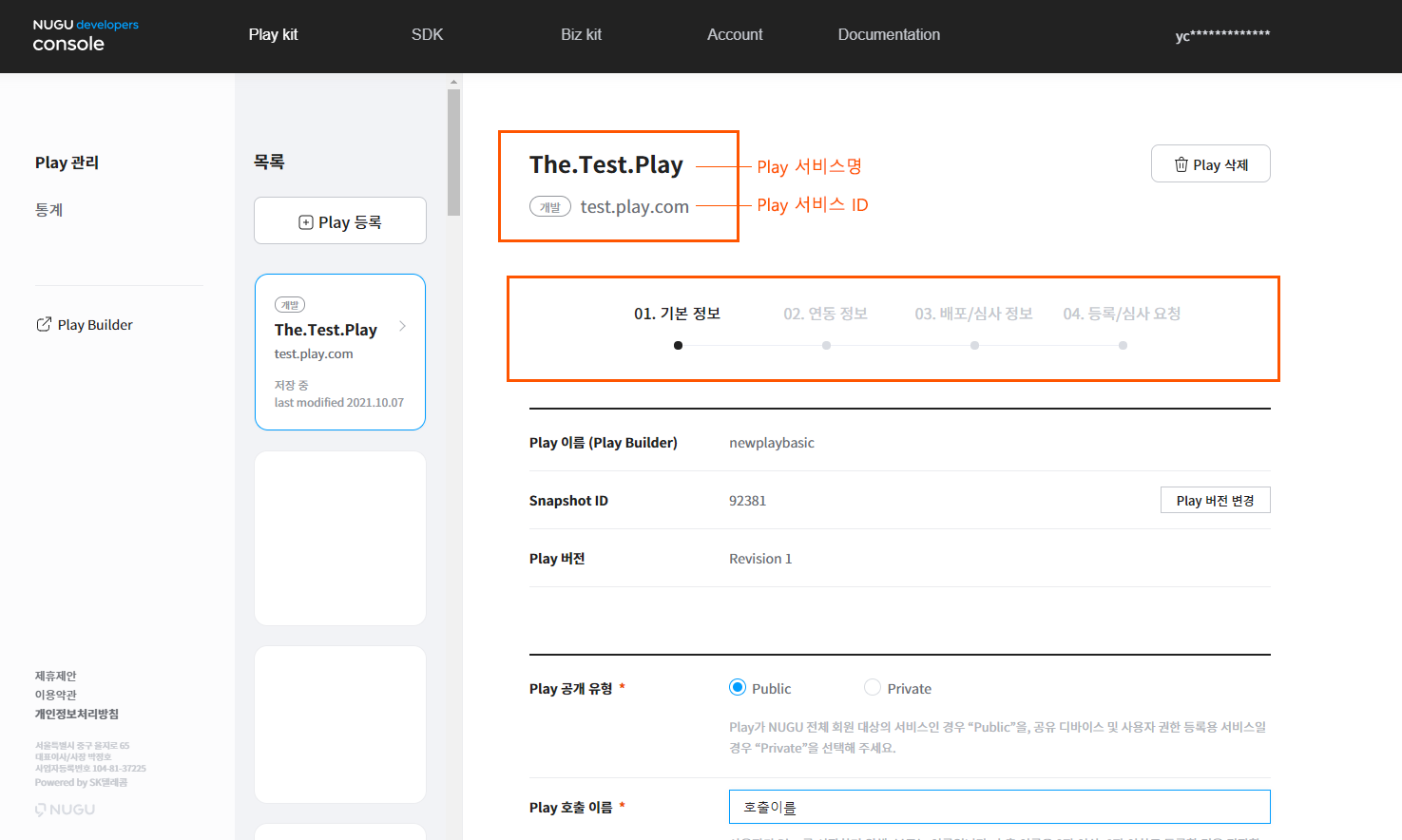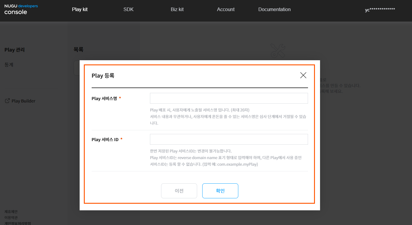4. 사용자에게 노출될 Play 서비스명과, 고유한 Play ID를 생성합니다.