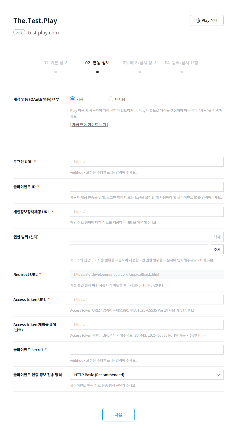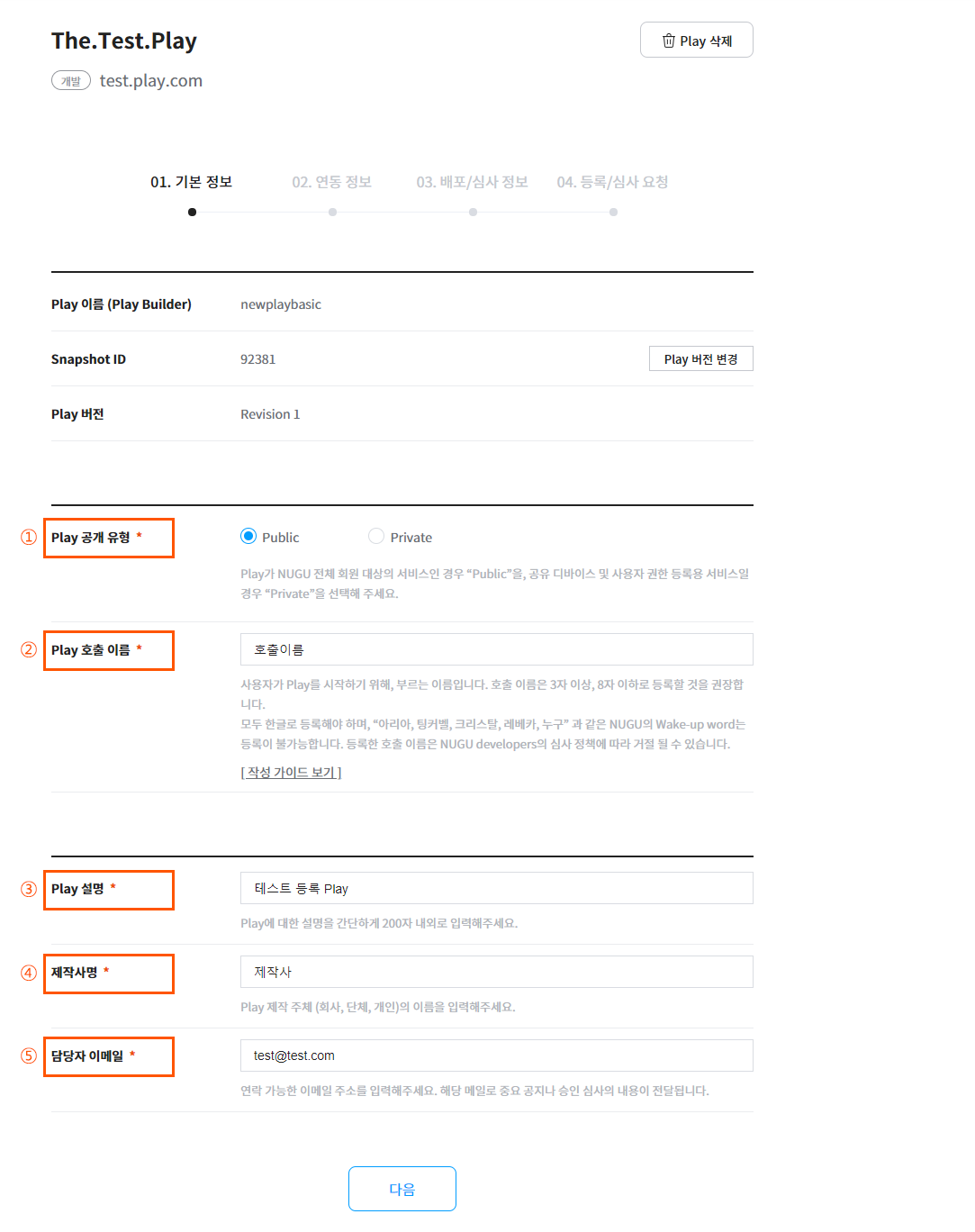 Play 기본 정보는 Play 관련 필수 정보로 아래의 내용들을 등록해야 합니다. 입력을 완료하면 다음 버튼을 클릭합니다.