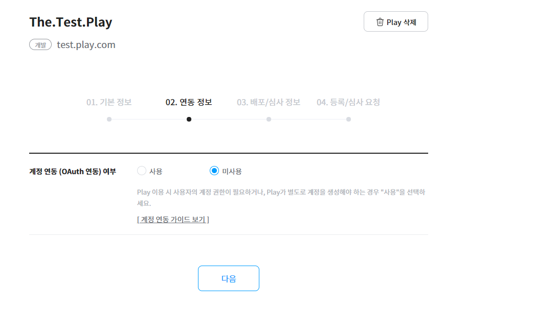 Play 서비스명과 Play 서비스 ID를 입력하여 넘어가면, 배포를 위한 4단계의 정보 입력 화면이 생성됩니다. Play 정보 등록은 총 4단계이며, 1단계 기본 정보 입력 → 2단계 연동 정보 입력 → 3단계 배포/심사 정보 → 4단계 등록/심사 요청의 순서로 진행됩니다.
