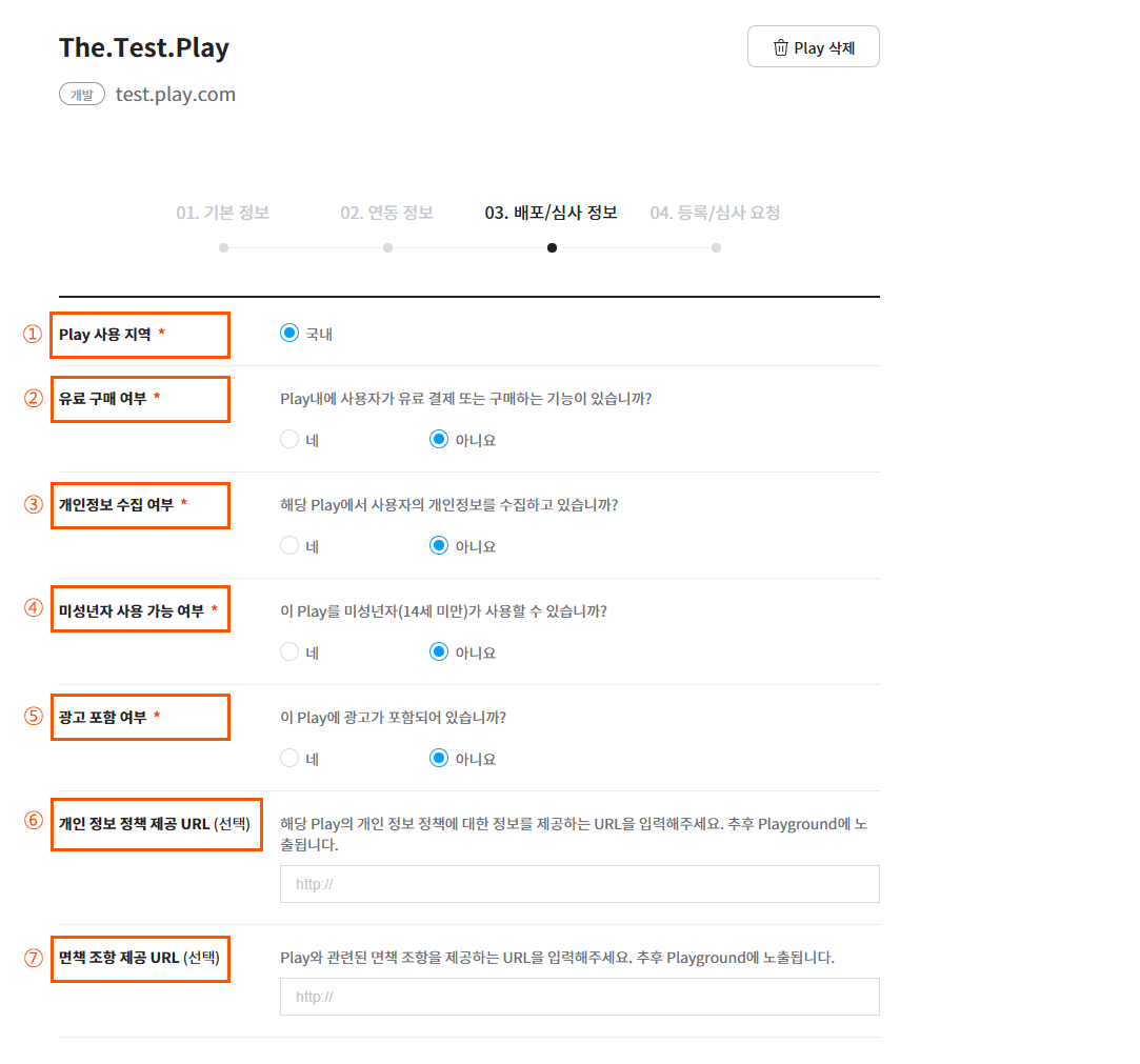 해당 Play의 개인 정보 정책에 대한 정보를 제공하는 URL을 입력해주세요. 추후 Play Ground에 정보가 제공됩니다.