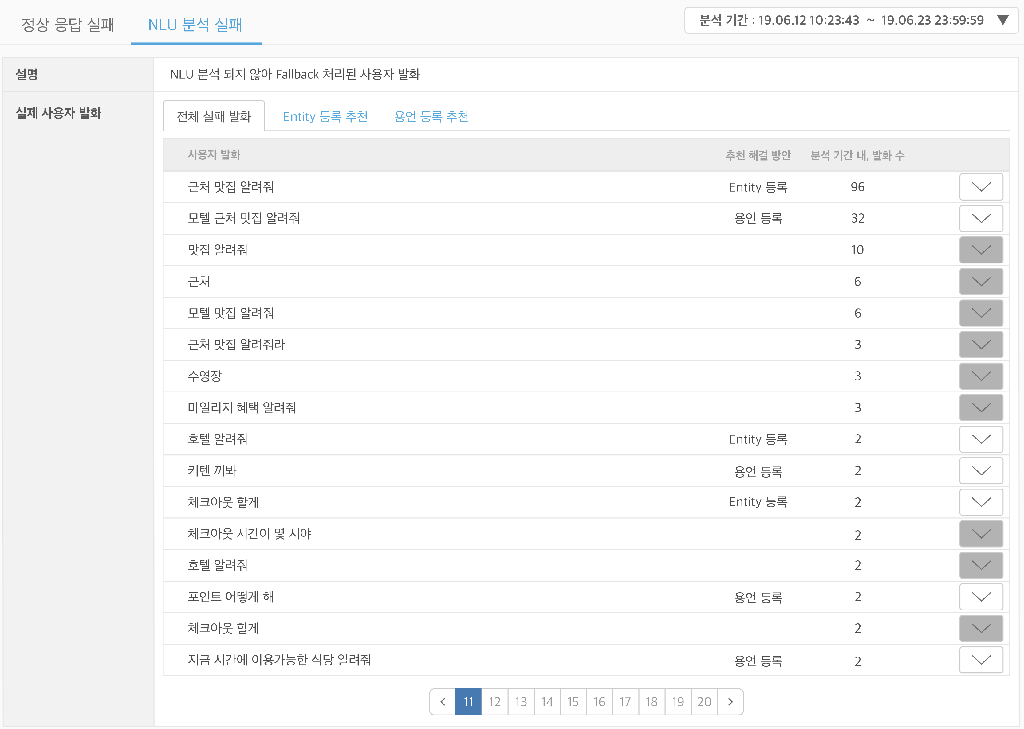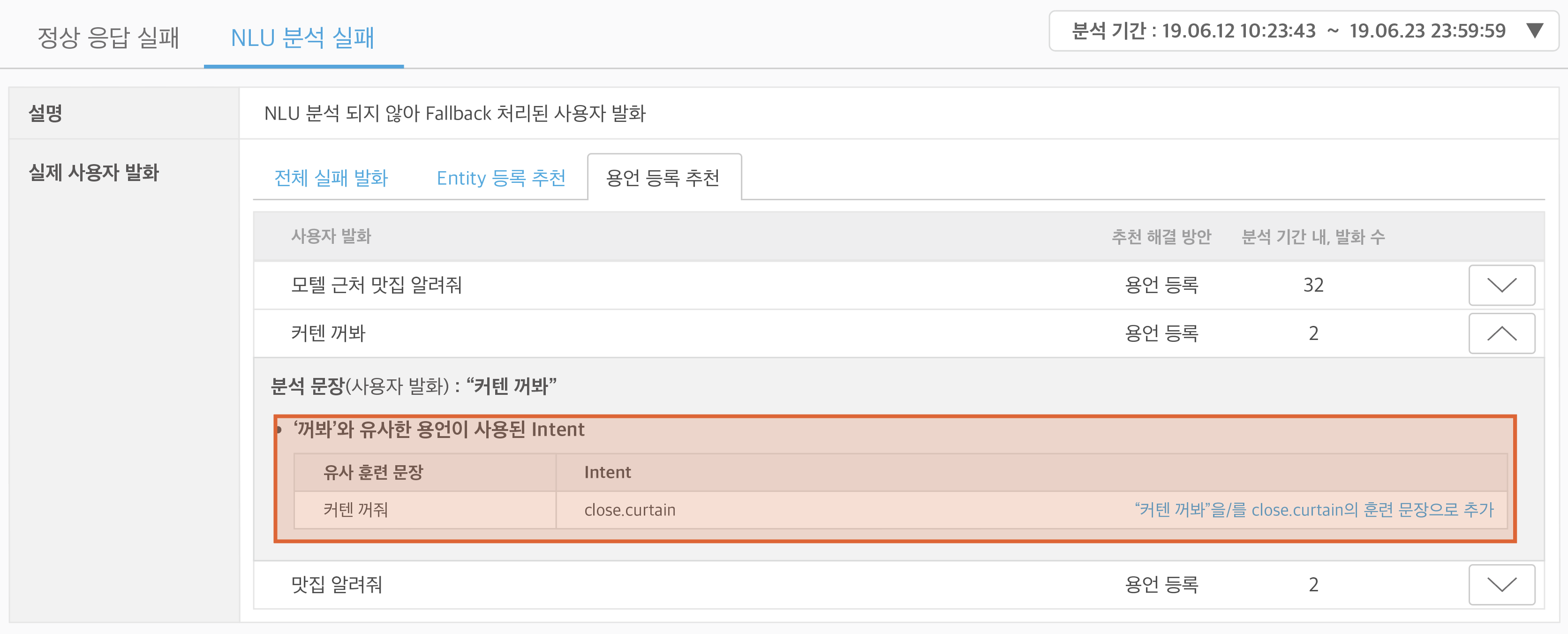 | 정상 응답 실패 | NLU 분석은 이루어졌으나, 정상 응답이 되지 않은 것으로 추정되는 발화 |
