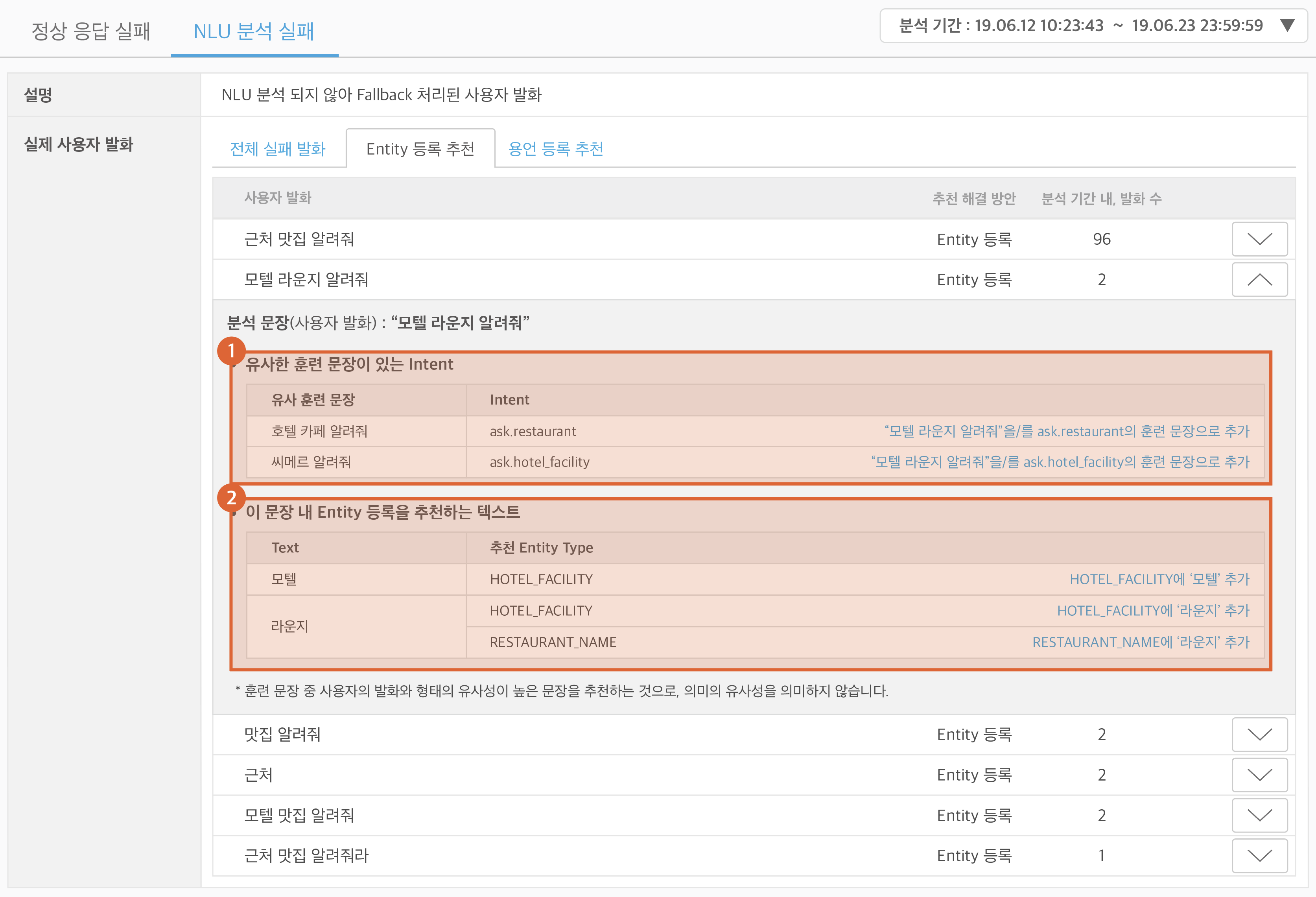 NLU 분석 실패 발화 내의 특정 단어가 Entity일 가능성이 있어서 Entity로 등록할 필요가 있다고 분석되는 경우에 추천 방안이 제시됩니다. 이 추천 결과를 통해 (1) 해당 문장 자체를 기존 Intent의 예상 발화로 추가하거나, (2) 발화 내의 특정 단어를 Entity로 추가하여 Model을 수정하는 것을 권장합니다.